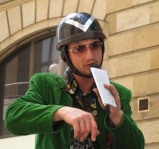 On pensait le métier de crieur public disparu des nos contrées : que nenni, Kevin Dylan Velours est une bombe, de la dynamite vivante, Superman réincarné en crieur sur échasses. Mais c’est avant tout un véritable artiste qui fait revivre pour le bonheur de tous un métier disparu en Europe. Sous ses airs de vrai filou de la parabole à la langue bien pendue se cache un homme qui redonne ses lettres de noblesse aux arts les plus démocratiques : les Arts de la Rue. Chapeau Monsieur l’Artiste !